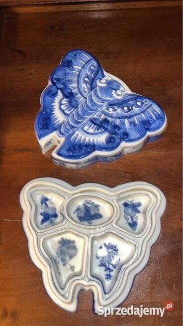 Motyl- pojemnik- puzderko Chińska porcelana Hors Doeuvre Sushi Butterfly Blue White Covered Ten niezwykły pojemnik ...